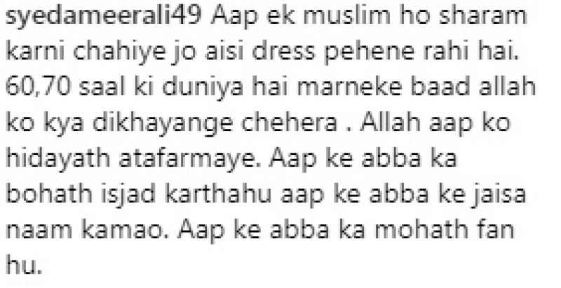 "Shame of u suhana ...joh karna hai karo.per indian culture ke ishaab seh post karo apna photo ...yeh sab private rako.itna respect karta hun apke papa ko.. but I didn't expected from you... (Shame on you Suhana...do whatever you want, but keep the Indian culture in mind. Keep these pictures private. I have so much respect for your father, but I did not expect this from you)" read a comment.