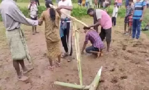 In a chilling act of mob justice, villagers assembled in large numbers to witness the punishment. The couple was bound to a makeshift yoke fashioned from bamboo and wooden logs, then forced to drag it across a field, mimicking ploughing animals. No one from the crowd intervened to stop the degrading act.