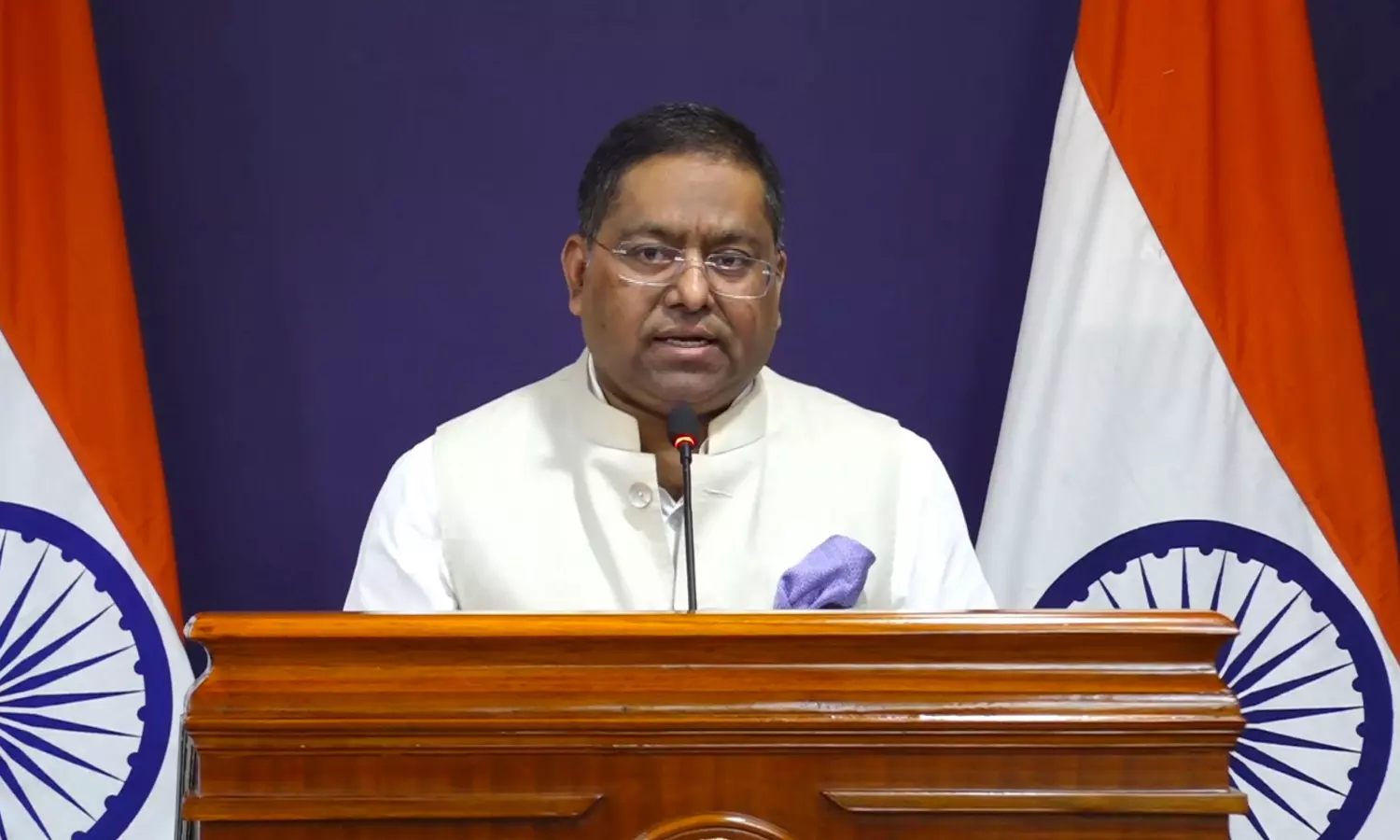 Ministry of External Affairs Spokesperson Randhir Jaiswal addresses a press conference, in New Delhi, Thursday. (PTI Photo)