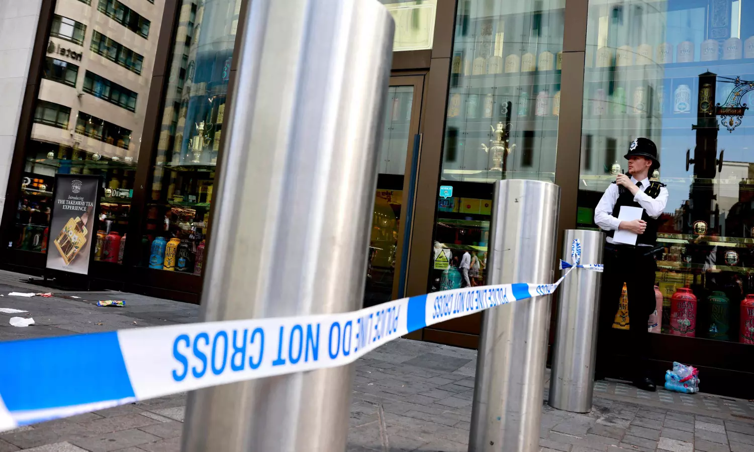 A photograph taken on August 12, 2024 shows a police officer standing by a cordoned off area in Leicester square, London. A woman and an 11-year-old girl were hospitalised on August 12 after being stabbed in central London's famous Leicester Square, police said, adding that a man had been arrested. (Photo by BENJAMIN CREMEL / AFP)