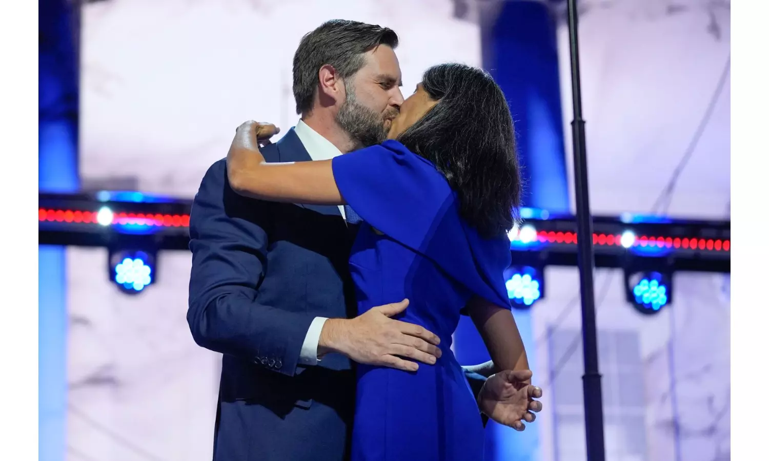 Republican vice presidential candidate Sen. JD Vance, R-Ohio, kisses his wife Usha Chilukuri Vance after speaking at the third day of the Republican National Convention at the Fiserv Forum. (Image: AP)