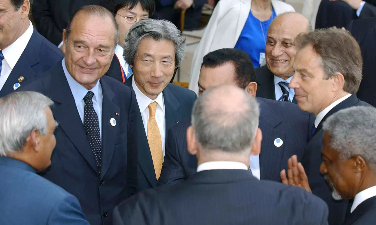 Japanese Prime Minister Junichiro Koizumi (C) walks with French President Jacques Chirac (L) and British Prime Minister Tony Blair (R) as they meet Indian Prime Minister Atal Behari Vajpayee (L-back to camera) and United Nations Secretary General Kofi Annan (R-back to camera) in Evian June 1, 2003. Leaders of the Group of Eight - the United States, Japan, Germany, France, Britain, Italy, Canada and Russia joined counterparts from 12 major developing countries to discuss debt relief, AIDS and access to clean water. REUTERS/Pool