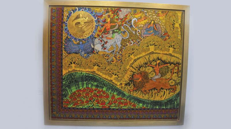 Durga Bai and Subhash Vyam have displayed their Gond art works titled ‘Purani Shaadi’ and ‘Nayi Shaadi’. The old weddings portrayed show involvement of every element in the village, from birds which present omens at weddings to decorated trees and detailed village life. It took a long process for two people to become husband and wife. The new wedding series showcases the contemporary times, with the wedding losing its spirit of communal involvement. The contrast is a commentary on the way society has evolved and how love and marriage have changed.