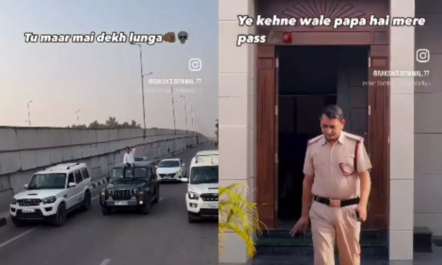 The video begins with Rakshit perched on the car roof, violating traffic laws on what appears to be a busy road. It then transitions to show his father, dressed in police uniform, seated inside the vehicle. The video caption reads: "Tu maar mai dekh lunga, ye kehne vaale papa hai mere" ("You hit, I’ll handle it. I have a father who says this").